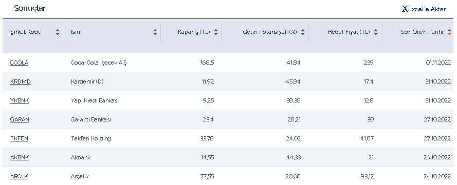 Son 1 ayda hedef fiyatı değişen şirketlerin getiri potansiyellerini aşağıda inceleyebilirsiniz.