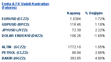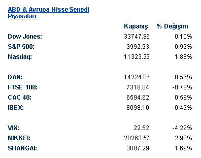 Avrupa endekslerinde ise karışık seyir hakimdi. Euro Stoxx 50 endeksi %0.57 ve DAX endeksi %0.56 oranında değerlenirken FTSE100 endeksi %0.78 oranında düşüş yaşadı. FTSE100 endeksinde hammadde %2.85, enerji %1.85 ve finans %1.46 oranında primlenerek en iyi performansı sergilerken sağlık %4.9, sanayi %3.37 ve temel tüketim %2.46 oranında değer kaybederek en kötü performansı sergileyen sektörler oldular. DAX endeksinde ise takdirsel tüketim %3.42 ve gayrimenkul %2.46 oranında yükselerek en çok değerlenen sektörler olurken iletişim servisleri %2.82 ve altyapı %2.02 ile en çok düşüş yaşayan sektörler oldular.
