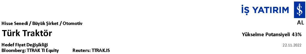Hedef fiyatımızda yukarı yönlü revizyon. TTRAK için hisse başına hedef fiyatımızı, 2022 ve 2023 için yurtiçi traktör pazarı tahminimizdeki artış, yüksek seyreden traktör fiyatları ve FAVÖK marjı varsayımlarımızdaki yukarı revizyon, ve makro tahminlerimizdeki güncelleme nedeniyle önceki 416.43 TL’den 635.0 TL’ye yükseltiyoruz. Tedarik koşullarındaki iyileşme sayesinde Türk Traktör, Ekim ayından itibaren aylık üretim temposunu 3.3 binden 4.4 bine çıkararak, 9A22’de kaybettiği pazar payının bir kısmını geri aldı. Türk Traktör’ün 2023’te satış fiyatlarındaki artış desteğiyle %33 FAVÖK ve %20 net kar büyümesi elde edeceğini tahmin ediyoruz. Hisse 2023T 5.6x FD/FAVÖK ve 8.5x F/K çarpanı ile global benzer şirketlerin 9.7x FD/FAVÖK ve 12.8x F/K medyanına kıyasla iskontolu işlem görmekte. Hisse ayrıca 5 yıllık tarihi 8.9x FD/FAVÖK’üne ve 12.2x F/K ortalamasına göre de iskontolu işlem görmektedir. Tüm bunlara ek olarak, şirketin 2023 yılında 1.76 milyar TL temettü dağıtacağını öngörüyoruz. Temettü tahminimiz %7.4 temettü verimine işaret ediyor. Bu nedenlerle hisse için AL tavsiyemizi koruyoruz.
