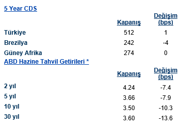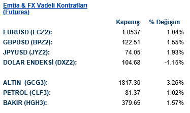 Powell’ın açıklamaları ve DXY’nin düşüşü ile beraber tahvil getirilerinde dünya geneli bir düşüş sözkonusu. ABD 10 yıllık tahvil getirileri 9,9 baz puan düşüşle %3,50 puandan günü tamamladı. İngiltere 10 yıllık tahvil getirisi 5,5 baz puan düşüşle %3,09 seviyesinden işlem görürken Almanya 10 yıllık tahvil getirileri 11,7 baz puan düşüşle %3,68 seviyesinden bugünü bitirdi. Gelişmekte olan ülkelerin USD tahvil getirilerinde de benzer bir durum görüldü. Türkiye 10 yıllık USd tahvil getirisi 14,2 baz puan düşüşle %8,66 seviyesinden işlem görmekte. Türkiye 5 yıllık risk primi ise 14,50 puan düşerek 511,92 seviyesinden fiyatlandı.