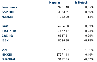 FAANG hisseleri Meta (Facebook) +%1,23, Apple +%1,21, Amazon +%2,14, Netflix +%0,6 ve Google –%1,30 performans ile günü tamamladı.