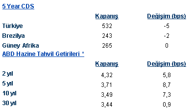 Türk hazine eurotahvilleri iki günlük değer kaybının ardından, bugün alıcılı işlem gördü. Getiri eğrisi 10-20 baz puan aralığında daralma gösterirken, dün 545 baz puana yükselen ülke risk primi bugün daha pozitif işlemler sonucu 530 baz puana geriledi. Geçtiğimiz ay ihraç olan 2028 vadeli hazine kıymetinde getiri %8,70 bölgesinde kapanış yaptı. Şirket tarafında lokal alımları, gelecek haftanın yoğun gündemi öncesinde yavaşlamaya başladı. Son dönem yaşanan ralli sonrası lokallerin 2023-24 bölgesinde satış ilgisine karşılık, daha çok 2024 bölgesinde yine lokal ilgisi devam etti. Türk Telekom, Ülker ve İBB gibi daha yüksek getiri sunan kıymetlerde bireysellerin düşük hacimli alımları öne çıktı.