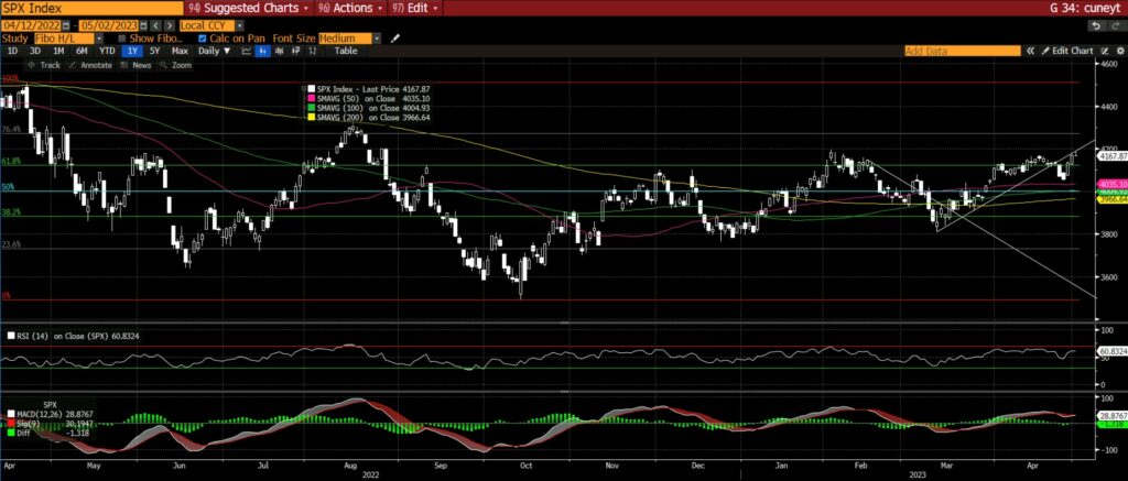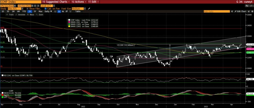 Teknik olarak bakıldığında geçtiğimiz hafta 50 günlük ortalamasından destek bulan S&P 500 endeksi 2023 zirve arayışına devam etmekte – 4200 üzeri kapanışlarda endeksin ilk etapta 4280 FIBO seviyesine kadar yükselmesi beklenebilir. Alt tarafta ise 4120 FIBO altında endeksin 50 günlük hareketli ortalamasına denk gelen 4035’e kadar önemli bir desteği bulunmazken, yükselen trendin bozulması için 3960’taki 200 günlük ortalama takip edilmeli. Nasdaq ise Ekim ayında başlayan trend kanalı korunmaya devam ederken, S&P 500 gibi 2023 zirve arayışındaki endeksinde 12300 üzeri kapanışlarda ilk hedefi 13000’li seviyeler olacaktır. Alt tarafta ise 11800-12000 aralığındaki FIBO ve 50 günlük ortalamanın destek konumunda olduğu endekste, bu seviyelerin altındaki kapanışlarda kar realizasyonlarının hızlanması beklenebilir.