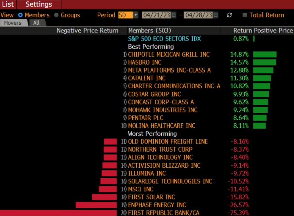 Geçtiğimiz hafta açıklanan teknoloji ağırlıklı bilançoların 2023 zirvelerini zorlamakta olan endekslerdeki etkisi sınırlı kalırken, bölgesel bankalardan First Republic Bank’in $100 milyarlık mevduat kaybettiği açıklaması ardından sektörde artan baskıya rağmen S&P 500 ve Nasdaq haftayı artı seviyelerde kapatmayı başardı. Sektörel olarak beklentilerin üzerinde rakamlar açıklayan mega-cap teknoloji devlerinin etkisinde teknoloji ağırlıklı Nasdaq tarafındaki haftalık yükseliş +1.3%e ulaşırken, S&P 500 endeksi +0.9% değer kazandı. 2022 yılının en fazla değer kaybeden şirketleri arasında yer alan Meta Platforms (META) artan kullanıcı tabanına paralel ilk çeyrekte analist tahminlerinin üzerinde kalırken, AI kullanımının daha verimli hale getirdiği operasyonlarının etkisinde ikinci çeyrekte piyasa beklentilerinin üzerinde ciro hedefleri açıkladı. Şirketin yaratmaya devam ettiği kuvvetli nakit akışının metaverse yatırımlarındaki kayıpları gölgede bıraktığı Meta Platforms haftayı +13% yükselişe sonlandırırken hissenin 2023 yılı performansı +98%’e ulaşmış durumda. Endekslerin performans açısından gerisinde kalan şirketler arasında ise bilanço hayal kırıklıkları öne çıktı. Finans sektöründe SVB ve Signature Bank ardından en zayıf halka olan First Republic Bank (FRC)’in geçtiğimiz hafta açıkladığı bilançosunda $100 milyarlık mevduat kaybı öne çıkarken likiditesi tekrardan sorgulanmaya başlanan bankaya el konulacağı spekülasyonların etkisinde haftayı -75% düşüşle sonlandırdı. Güneş enerjisi şirketlerinden Enphase Energy (ENPH) ise ilk çeyrek rakamlarında analist beklentilerinin üzerinde karlılık açıklamasına rağmen ikinci çeyrek ciro beklentisine yönelik piyasa beklentilerinin altında bir aralık belirlemesi büyüme temasına paralel yüksek çarpanla işlem gören hissenin sert değer kaybetmesine neden oldu. Haftayı -26.5% değer kaybıyla sonlandıran Enphase’in açıklamalarına paralel sektördeki diğer şirketlerde negatif etkilenirken First Solar (FSLR) -15.8% ve Solaredge (SEDG) -10.5% geriledi. Şirket satın almalarda ise Microsoft (MSFT)’un Activision satın alımı yeni bir engele takılırken bu sefer İngiliz Rekabet Kurulu tarafından birleşmeye itiraz ettiğini açıkladı. Temmuz ayında tamamlanması beklenen $69 milyarlık (hisse senedi başında $95 nakit karşılığında) satın alma teklifinin İngiltere nezdinde uğradığı engele paralel Activision hisse senetleri haftayı -9% düşüşle sonlandırdı.