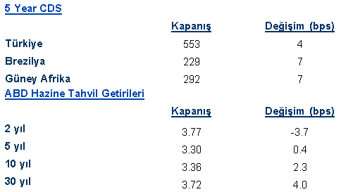 Hacimlerin hem borsa hem de eurobond tarafında sert şekilde düştüğü Türkiye’de ise tahvil piyasası diğer ülkelere göre negatif ayrışmayı sürdürüyor. Hacimlerdeki düşüşün en önemli nedenlerinden biri ise 5 yıllık CDS’in bu hafta %3,41 yükselerek 553,3 seviyesine yükselmiş olmasıydı. Bugün Türkiye 2 yıllık tahvil getirisi 5,9 baz puan yükselerek %8,228 seviyesine yükselirken uzun taraf yatay pozitif seyretti ve 10 yıllık tahvil getirisi günü %8,644 seviyesinde kapattı.