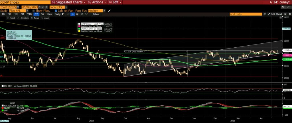 Teknik olarak geçtiğimiz hafta 50 günlük desteğini test eden S&P 500, Cuma günkü +1.8%’lik yükselişle haftalık kapanışı 4130 FIBO direncinin üzerinde kapatmayı başardı. Momentumun zayıf olduğu endekste 4120 Bollinger orta bandının altında geçtiğimiz hafta test edilen 4040’taki 50 günlük hareketli ortalama destek konumunu korumakta. Üst tarafta ise endeksin ilk etapta 2023 zirvesi olan 4200 ve üzerindeki kapanışlarda 4300-4320 aralığı hedeflenecektir. Ekim ayında başlayan trend kanalını korumakta olan Nasdaq tarafında ise kapanış bazlı 2023 zirvesine ulaşan endeksin önünde 12500 FIBO ve ardından trend kanalının üst bandı olan 13000 yeni hedefler konumunda. Alt tarafta ise endeksin 12000 altında olası kapanışlarında 11800’deki 50 günlük ortalama ve 11650 FIBO destek seviyeleri olarak takip edilecek.