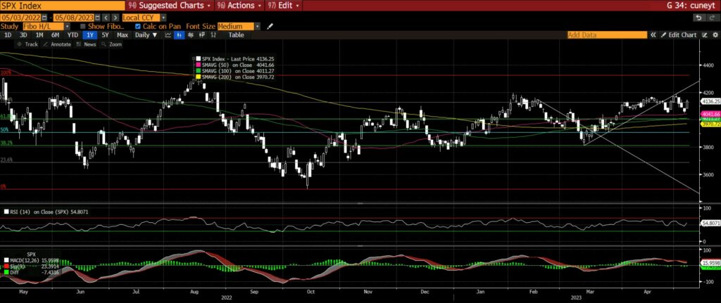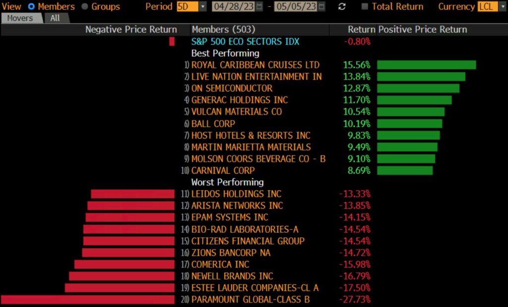 Beklentiler dahilinde gerçekleştirilen 25 baz puanlık faiz arttırımı ardından beklemeye geçen FED’e rağmen, Powell’ın şahin tondaki açıklamaları ve ekonomik verilerdeki yukarı yönlü sürprizler endekslerde destek seviyelerine doğru kar realizasyonlarını tetiklemeye yetti. Ancak, Apple (AAPL) bir kez daha endekslerdeki liderlik rolünü Perşembe günkü seans kapanışı ardından gerçekleştirdiği bilanço açıklamasıyla geri kazandı. Tedarik zincirinde yaşanan aksaklıkların azalmasıyla kuvvetli iPhone satışlarının desteklediği ilk çeyrek bilançosunda, 90 milyarlık hisse geri alım programı açıklayan ve temettü oranını 4% arttıran Apple’ın +4.7% değer kazandığı Cuma günkü kapanışı S&P 500 haftalık bazda -0.8% düşüşle kapatırken, Nasdaq ise bir önceki hafta kapanış seviyesini korumayı başardı. Sektörel bazda artan resesyon beklentileri ve FED’in şahin bekleme kararı ardından 2023 yılı dip seviyelerine ulaşan petrol fiyatlarına paralel enerji sektörü baskı altında kalırken, Apple’ın önderliğinde teknoloji sektörü geçtiğimiz haftanın pozitif ayrışan sektörü oldu. Şirket bazlı hareketlerde de bilanço açıklamalarının etkisi görülürken, COVID döneminde en fazla yara alan sektörlerinin başında gelen cruise şirketlerinden Royal Caribbean (RCL) seyahat talebinde yaşanmakta olan artışa paralel 2023 yıl sonu hisse başı karlılık beklentisini 50% oranda arttırmasıyla haftayı 15.5% yükselişle sonlandırdı. S&P 500’de haftanın kaybedeni ise medya sektöründen Paramount Global (PARA) olurken, beklentilerin altındaki ilk çeyrek rakamlarına ek olarak likidite yönetimi paralelinde temettü oranını 80% düşürdüğünü açıklayan Paramount -27.7% değer kaybetti. Son dönemin gündemde öne çıkan bölgesel bankalarında da geçtiğimiz hafta hareketlilik devam ederken, domino taşlarında sıradaki adaylar olarak öne çıkan PacWest (PACW) haftayı -43% düşüşle sonlandırırken, Western Alliance (WAL) ise Cuma günkü tepkiye rağmen -26.8% geriledi.