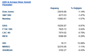 ABD endekslerine baktığımızda Dow Jones %1.14, S&P500 %1.47 ve Nasdaq %1.57 oranında değer kaybederek günü sonlandırdılar. Dow Jones endeksinde sağlık %0.42 ve enerji %0.55 oranında değer kaybederek en az düşüş yaşayan sektörler olurken IT %1.91 ve sanayi %1.68 ile en çok düşüş yaşayan sektörler oldular. S&P500 endeksinde ise enerji %0.50 ve sağlık %0.86 oranında değer kaybıyla görece diğer sektörlerden daha iyi performans sergilerken altyapı %3.05 ve takdirsel tüketim %2.03 oranında düşüş ile en kötü performansı gösteren sektörler oldular.