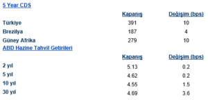 ABD tarafında faizlerin uzun süre yüksek kalacağı beklentisine ek olarak FED üyesi Kashkari’den gelen faiz arttırım sinyalleri ile Dolar Endeksi’nde yaşanan yukarı hareket ABD hazine tahvillerine de satış getirdi. ABD 10 yıllık getiriler 4.50-4.55 bandında hareket ederken, getiriler seans sonunda  1.6 baz puan yukarıdaydı. Benzer şekilde, 2 yıllık getiriler 2.0, 5 yıllık getiriler ise 1.1 baz puan yukarıda işlem görerek ABD seansını sonlandırdı. 2 yıllık ABD tahvil ihracında getiriler 5.085 olurken bu seviye 2006 yılından bu zamana en yüksek seviye olarak dikkat çekti. Hafta başından itibaren görülen satış ilgisi Avrupa ve Asya tarafında da izlenirken Fransa 10 yıllık getiriler 2 baz puan, Almanya 10 yıllık getiriler 1.1 baz puan artıda olarak günü sonlandırdılar. Lokal tarafta da satılı bir seyir hakimdi, getiri eğrisi genelinde 3.0-5.0 baz puan aralığında yükseliş görüldü ve 10 yıl vadeli kıymet 8.42 getiri seviyesinden günü sonlandırdı. 5 yıllık ülke risk primi 382 seviyesinden 390’a yükselerek satışı desteklerken şirket kıymetlerinde yatay negatif seyir görüldü. İş Bankası 2030 kıymeti 1 baz puan yükselerek 98.31 seviyelerinden, TSKB 2028 kıymeti 0.7 baz puan yükselerek 100.72 seviyelerinden işlem gördü.