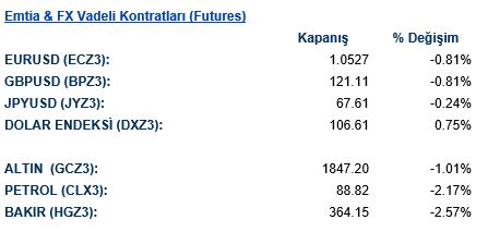 Ons altın yeni haftaya $1848 seviyelerinde giriş yaptı ve son dönemde Dolar endeksindeki yükselişle birlikte başladı kayıplarını sürdürdü. Yaklaşık $20 değer kaybı ile $1829 seviyelerinde tamamlayan altın son 7 ayın en düşük seviyesine gerilemiş oldu. Ons gümüş de güne $22.18 seviyelerinde başladı ve %4.25’lik bir düşüşle günü $21.23 seviyelerinde kapattı. WTI kontratları günü %2,33’lük bir düşüşle $88,95 seviyesinde kapatırken; Brent petrol de % 4,82’lik bir düşüşle günü $90,71 seviyesinde kapattı.