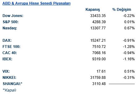 Ekim ayının ilk işlem gününde beklentileri aşan ISM imalat ve imalat PMI verilerine ek olarak ISM istihdam verisinin 48.5 daralma bölgesinden 51.2 seviyesine yükselmesi Cuma günü açıklanacak olan tarım-dışı istihdam verisinde artışa işaret edebilir. Verilerde yaşanan toparlanmalar piyasanın soğumadığını göstermekte. Bu nedenle FED’in faiz artışlarını bitirmemesi gündemde. FED vadelilerine göre yıl sonu yada 2024 Ocak ayında faiz artırımı olasılığı artış gösterdi. Akşam saatlerinde FED yetkililerinden Michael Barr FED’in yeterince yüksek bir politika faizini uyguladığını ve asıl konunun ne kadar bu yüksek faiz seviyelerinde kalınacağının önemli olduğuna vurgu yaptı. FED Başkanı Powell da benzer şekilde faiz artırımlarından sonra fiyat istikrarının daha sağlıklı bir istihdam piyasası için önemli olduğunu ve maaşların daha düşük olduğu kesimde maaş artışlarının önemine vurgu yaptı. ABD hükümetinde kapanma tehlikesi son anda ortadan kalmış durumda. ABD tahvillerinde satışlar getirilerde ise son 16 senenin en yüksek seviyelere gelmesi piyasaları baskılıyor. Buna rağmen ABD hisse senetleri piyasalarında desteklere tutunma hareketi izlendi. Dow Jones %0.22 gerilemeyle 33433.35 seviyesinde kapanış yaparken, S&P 500 yatay artıda 4288.39, Nasdaq ise %0.67 primli 13307.77 seviyesinde kapandı. Çin piyasaları tüm hafta ulusal tatil nedeniyle kapalı.