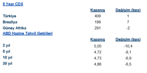 Sabah saatlerinde yükselen ve 423 seviyesini gören Türkiye 5 yıllık CDS’i, öğleden sonraki geri çekilmeyle birlikte günü 408 seviyesinde tamamladı. Düşüş ile birlikte hazine tahvillerine olan talep artarken alım iştahı özellikle getiri eğrisinin orta kısmında yoğunluk gösterdi. Türkiye 2 yıllık hazine tahvilinin getiriş 1.8 baz puanlık düşüşle 7.47% seviyesine gerilerken 5 yıllık tahvil 4.5 baz puanlık düşüşle 8.53%, 10 yıllık tahvil getirisi ise 0.2 baz puanlık gerilemeyle 8.88% seviyesinde günü tamamladı.