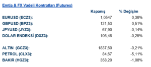 Ons altın düşüşünü henüz sonlandıramadı. Güne $1823 seviyelerinde başlayan altın %0.04’lük bir düşüşle günü $1822 seviyelerinde kapattı. Ons gümüş de günü %0.74’luk kayıpla $20.01 seviyelerinde kapattı. WTI kontratları günü %5,12’lik bir düşüşle $84,66 seviyesinde kapatırken; Brent petrol de % 5,19’luk bir düşüşle günü $86,20 seviyesinde kapattı.