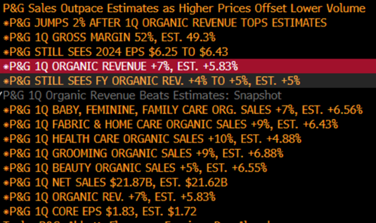 Yaklaşık $345 milyar piyasa değerine sahip Procter & Gamble 2024 mali yılı 1. çeyreğinde $1.83 ile $1.72 seviyesinde yer alan beklentinin üzerinde hisse başı kar açıkladı. İlgili dönemde net satış kalemi $21.87 milyar ile $21.62 milyar beklentisinin üzerinde gerçekleşti ve geçen yılın aynı dönemine göre %6.1 artış kaydetti. Şirket bir önceki yılın aynı döneminde $20.61 milyar net satış ve $1.57 hisse başı kazanç açıklamıştı. Ev bakım ürünleri geliri $7.65 milyar, güzellik ürünleri geliri $4.10 milyar ve sağlık ürünleri geliri ise $3.07 milyar oldu, beklentiler sırasıyla $7.47, $4.18 ve $2.89’du. Şirketin organik gelirleri, %5.83 beklentisinin üzerinde, %7 artış kaydetti. Artışın önemli kısmı yüksek fiyatlamadan kaynaklandı ancak azalan nakliyat hacimleri organik geliri kısmi baskıladı. Şirket 2024 mali yılı için hisse başı kar beklentisini  $6.25 ile $6.43 arasında açıklarken, $9 milyar temettü ile $5 – $6 milyar arasında hisse geri alımı gerçekleştireceğini belirtti.