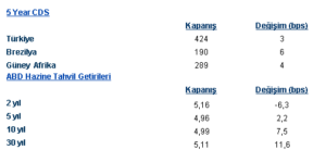 Küresel risk iştahının düşük olduğu işlem gününde gelişmekte olan tahvil piyasaları negatif performans gösterdi. Türkiye eurotahvilleri de günü negatif performansla kapadı. 5 yıllık CDS sabah saatlerinde 429 seviyesine yükselmesine rağmen günün kalanında 424 seviyesine geriledi ve günlükte 1 baz puan artış gösterdi. 2 yıllık eurotahvil getirisi 8.5 baz artarken 10 yıllık eurotahvil getirisi ise 12.5 baz puanlık artış gösterdi.