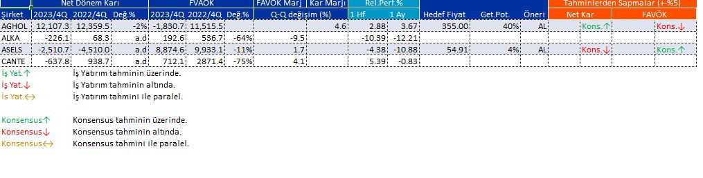 Raporun içinde ise, şu ana kadar finansallarını açıklayan BIST şirketlerini, kümüle edilerek toplanmış toplu piyasa ve sektör karlılıklarını ve piyasa tahminleri ile açıklanan finansal sonuçların karşılaştırmalı analizini bulabilirsiniz.