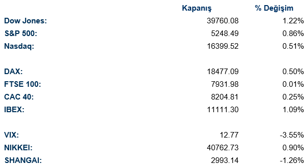 Tarihsel zirve seviyelerine yakın seviyelerden işlem görmeye devam eden ABD hisse senedi piyasaları üç seanslık değer kayıplarının ardından yatay pozitif geçirdiği seansı son yarım saat gelen alımlarla primlenerek tamamladı. S&P 500 %0,86 primlenerek 5.248 seviyesinden günü sonlandırırken Dow Jones %1,22 ve Nasdaq %0,51 primlendi. S&P 500’de on bir sektörün tamamı değer kazanırken %2,75 ile altyapı, %2,42 ile emlak ve %1,6 ile sanayi ön plana çıktı. İlk işlem gününde %16 primlenen Trump Media & Technology hareketine devam ederek Çarşamba gününü ise %14,2 primlenerek sonlandırdı. DraftKings şirketi, ESPN muhabirinin X üzerinden yaptığı açıklamalara göre NCAA başkanı Baker’la üniversiteli öğrenciler üzerine yapılan yan bahislerin sonlandırması üzerine çalışmalar gerçekleştiriyor, haberin ardından şirket %6,84 değer kaybetti. Amazon’un Premium Beauty Store üzerinden Estee Lauder’in ürünlerini satacağını duyurmasının ardından Estee Lauder %4,13 primlenirken Amazon %0,86 primlendi. Komisyonsuz işlem aracılığı ile tanınan Robinhood ABD’li kullanıcıları için kredi kartı hizmetleri de sunacağını açıkladı ve %3,79 değer kazanarak günü sonlandırdı. SMCI ve NVIDIA ise günü negatif tarafta sonlandıran şirketler olurken değer kayıpları %0,17 ile %2,5 oldu. Öte yandan Tesla ise Citi tarafından hedef fiyatı $224’ten $196’ya tut seviyesi ile revize edilmesine rağmen seansı %1,22 kazançla sonlandırdı.