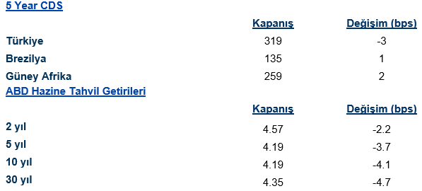 Bugün ABD’de 7 yıllık tahvil ihracı gerçekleşti ve getiri seviyesi %4.185 oldu. Amerikan tahvillerine gelen hafif alımlar getiri eğrisi boyunca 3-4 baz puanlık geri çekilmelere sebep oldu. 2 yıllık tahviller %4.57 getiri seviyesinde kapanış gerçekleştirirken; 5 yıllıklar %4.18; 10 yıllıklar ise %4.19 getiri seviyelerinde kapanış gerçekleştirdi. Avrupa tahvilleri de Amerikan tahvillerinin izinden gitti ve günü alıcılı kapattı. 2 yıllık tahvillere baktığımızda İngiltere’de %4.13, Fransa’da %2.80, Almanya’da %2.82 ve İtalya’da %3.34 getiri seviyelerinden kapanış gerçekleştirdi. 10 yıllıklarda ise getiriler İngiltere’de %3.93, Fransa’da %2.79, Almanya’da %2.29 ve İtalya’da %3.61 seviyelerinde. Türkiye’de ise bugün yaklaşık 4 baz puanlık düşüş yaşayan CDS le birlikte özellikle kısa vadede yoğunlaşan, getiri eğrisi boyunca yaklaşık 4 baz puanlık düşüş yaşayan getiri ile karşılaştık. Türkiye’de euro tahvil getirileri 2 yıllıklarda %5.84, 5 yıllıklarda %6.65; 10 yıllıklarda ise %7.39 seviyelerinde seyrediyor.