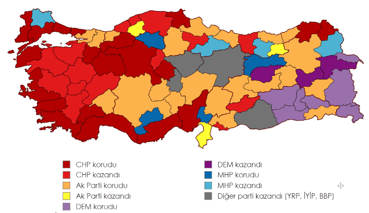 Hayat pahalılığının yoğun hissedildiği büyükşehirler başta olmak üzere ülke genelinde Cumhur ittifakı oylarının sert gerilediği görülüyor. CHP 2019’da kazandığı İstanbul, Ankara, Antalya, Mersin, Adana ve Eskişehir’de Cumhur ittifakı adayları ile farkı artırıp ve belediye meclis çoğunluğunu elde ediyor. Bursa, Balıkesir, Manisa, Denizli gibi geleneksel olarak merkez sağ ve milliyetçi partilerin yönettiği İç Ege ve Güney Marmara büyükşehir belediyeleri de meclis birinciliği ile beraber CHP’ye geçiyor.