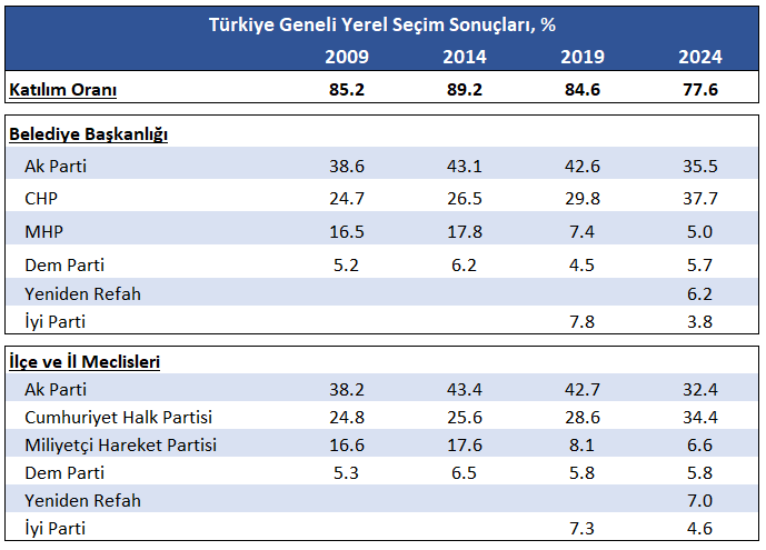 Ak Parti ve Cumhur İttifakı’nın oy kaybında önceki yerel seçimde %84,6 olan katılım oranının 7 yüzde puan düşüşle %77,6’ya gerilemesi ve Yeniden Refah’ın yükselişi etkili olmuş gözüküyor.