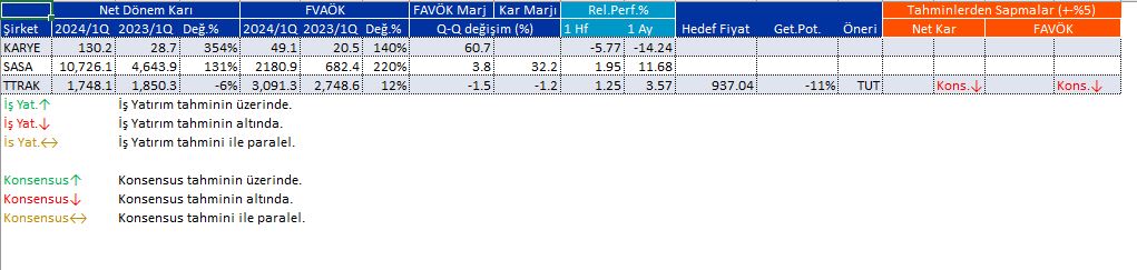 Burada yer alan fiyatlar, veriler ve bilgilerin tam ve doğru olduğu garanti edilemez. Hesaplamalarda doğru olduğu düşünülen, genel kabul görmüş formüller tüm şirketler için kullanılmıştır. Şirket özelinde tek seferlik gelir/gider kalemleri ihtiva eden, farklı hesaplama yapılması gereken şirketlerde farklılıklar görülebilir. Hesaplamalar farklı kaynaklar ile karşılaştırıldığında değişik sonuçlar görülebilir. Veriler İş Yatırım Menkul Değerler A.Ş. tarafından güvenilir olduğuna inanılan kaynaklardan alınmıştır. Hesaplamalarda kullanılan verilerin ve hesaplanan değişkenlerin doğruluğu garanti edilemez. Yapılacak filtremeler sonucu ulaşılacak sonuçlar herhangi bir yatırım aracının alım-satım önerisi ya da getiri vaadi olarak yorumlanmamalıdır. Bu sonuçlara dayanarak yatırım kararı verilmesi beklentilerinize uygun sonuçlar doğurmayabilir. Hesaplamalarda veya teknoloji farklılıkları nedeni ile ortaya çıkabilecek hatalardan İş Yatırım Menkul Değerler A.Ş. sorumlu değildir.