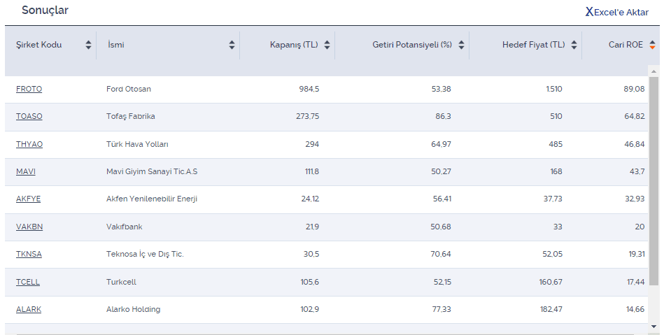 BIST 100’de en az %50 getiri potansiyeli olan ve özsermaye karlılığı yüksek şirketler listesini aşağıda inceleyebilirsiniz.
