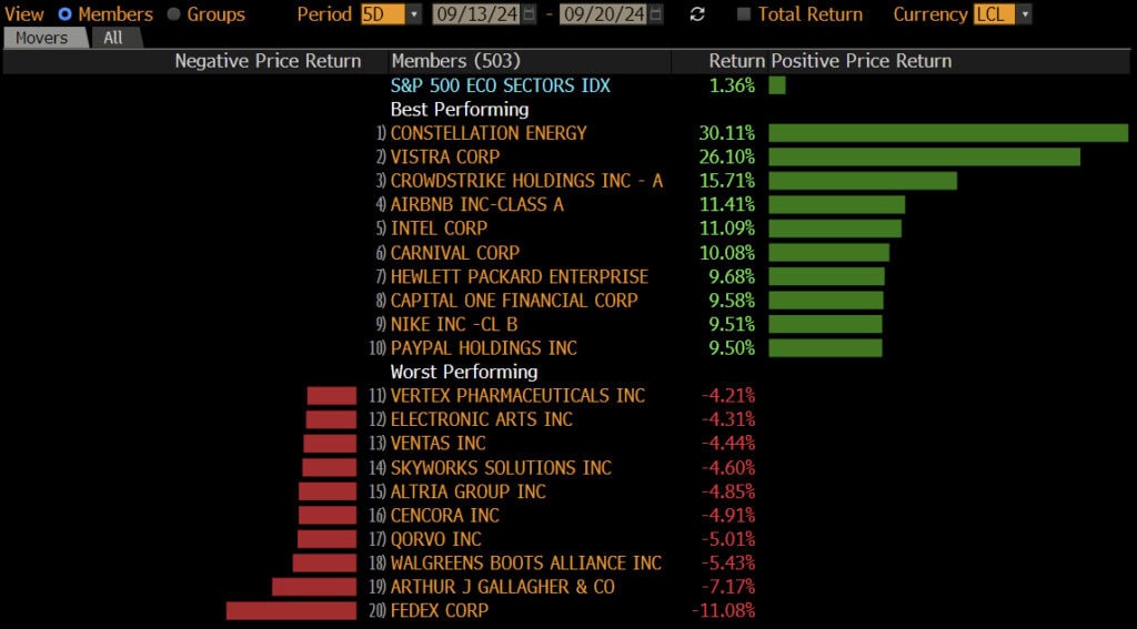 FED’in faiz indirimlerine 50 baz puanla başlaması, hisse senedi piyasalarında olumlu karşılandı ve Dow Jones 30 ile S&P 500 endeksleri yeni zirve seviyelerine ulaştı. S&P 500 haftayı +1.4% artışla tamamlarken, Nasdaq endeksi +1.5% değer kazandı. Defansif sektörler arasında yer alan sağlık, zorunlu tüketim, ve gayrimenkul şirketleri endekslerden negatif ayrışırken, “Muhteşem Yedili” olarak bilinen teknoloji devleri arasında sadece Nvidia, -2.6%’lük düşüşle haftanın kaybedeni oldu. Şirket bazlı gelişmelerde, S&P 500 endeksinde haftalık 30%’luk yükselişle ilk sayı alan yeşil enerji şirketlerinden Constellation Energy (CEG), Microsoft ile yaptığı 20 yıl vadeli anlaşmayı duyurdu. Bu anlaşma kapsamında, Pensilvanya’daki nükleer santrali yeniden devreye alınmasıyla elde edilen enerji, Microsoft’un yapay zeka merkezlerinin enerji ihtiyacını karşılamak için kullanılacak. 2024 yılında 60% değer kaybederek piyasa değeri 100 milyar doların altında gerileyen Intel (INTC), bu kez potansiyel bir satış haberiyle gündeme geldi. Wall Street Journal’ın haberine göre, sektörden Qualcomm (QCOM) Intel’i satın alma görüşmelerine başladı. Tarafların gizlilik nedeniyle yorum yapmadığı haber ardından, Intel hisse senetleri Cuma günkü seansta 15% yükseldikten sonra haftayı +11% artışla kapattı. Geçen haftanın bilançolarından biri olan FedEx (FDX)’in açıklamaları ise Amerikan ekonomisine dair erken bir uyarı niteliği taşıdı. Yeniden yapılanma sürecinin olumlu katkılarına rağmen, kargolarda tüketicilerin daha ekonomik seçenekleri tercih etmeleri nedeniyle beklentilerin altında hisse başı karlılık ve ciro açıklayan FedEx ayrıca, önümüzdeki seneye yönelik EPS beklentisini 5-10% oranında düşürdüğünü açıkladı.