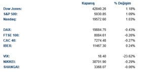 ABD endekslerinde Dow Jones %1.18, S&P 500 %1.09 ve Nasdaq endeksi %1.03 değer kazanarak günü tamamladı. Sektörlerde ise Dow Jones endeksinde finans %1.73, sağlık %1.26 ve enerji %1.20 değer kazandı. Geri kalan sektörler de pozitif bir şekilde günü sonlandırdı. S&P 500 endeksinde ise gayrimenkul %1.82, IT %1.53 ve altyapı %1.53 değer kazanarak günü tamamladı. Kurumsal gelişmelerde Nike açıkladığı finansallar ile kârı ve geliri Wall Street beklentilerini aşarken, hisse günü %0.21 değer kaybederek tamamladı. Berkshire, Occidental Petroleum’dan 405 milyon dolar değerinde yaklaşık 8,9 milyon hisse satın aldı ve şirketteki payını %28,1’e çıkardı. Occidental günü %3.9 değer kazanarak tamamladı.