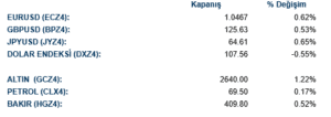 ABD tarafında gün içinde PCE verileri piyasa beklentilerine göre olumlu karşılanırken FED tarafında sonraki politika faiz kararı toplantısında faiz indirimi olasılığı %8 seviyesinde fiyatlanmakta. Dolar Endeksinde yaklaşık iki haftadır agresif olarak izlenen yükseliş trendi bugün 108 seviyesinin aşağı yönlü kırılmasıyla bozulurken 107,75 seviyesinde izlendi. Dolar Endeksindeki günlük değer kaybı %0,63 olarak takip edildi. 107,50 seviyesi önceki hareketliklere bağlı olarak destek seviyesi niteliğinde izlenebilir. Yukarı yönlü hareketliliğin oluşması halinde ise 107,85 seviyesi önceki hareketliliklere bağlı olarak direnç işlevi görebilir. EURUSD paritesi ise 1,042 seviyesinde işlem görürken günü 0,68%’lük değer kazancıyla kapattı. USD karşısında bugün bütün gelişmiş ülke para birimleri değer kazanırken en fazla değer kazançları %1,02 ile Norveç Kronu ve %0,72 ile Japon Yeni’nde izlendi.