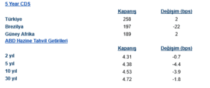 ABD tahvil piyasasında genel olarak alıcılı ortam izlenen ABD tahvil piyasasında 2 yıllık getirilerde yaklaşık 0,2 bps’lik düşüş gözlemlenirken 5 yıllık tahvil getirilerinde 4,1 bps’lik düşüş izlendi. 10 yıllık tahvillerde de 3,6’bps’lik düşüş izlendi. Avrupa tarafında da genel olarak alıcılı seyir hakimken yurtiçinde ise eurotahvil piyasası genel olarak satıcılı olarak izlenmekte. Kısa ve orta vadeli kıymetlerde satıcılı ortam daha belirgindi. CDS risk primi geçtiğimiz ayda görülen seviyelere geri dönerek 258 seviyesinden takip edilmekte.