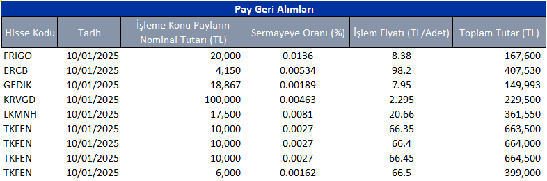 Pay geri alım programları kapsamında ilgili tarihte geri alım yapan şirketlerin listesini aşağıdaki tabloda bulabilirsiniz.