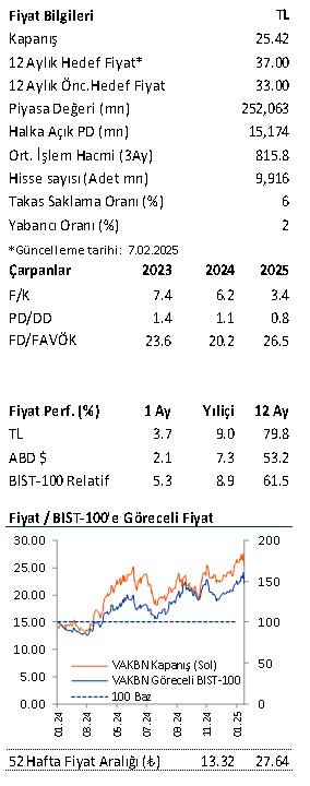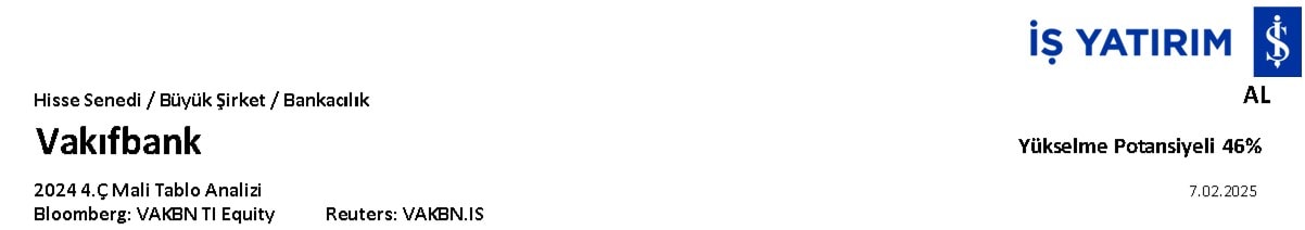 2025 hedefleri: Vakıfbank, 2025 yılında yüksek yirmili hanelerde bir TL kredi büyümesi ve yine yüksek tek haneli bir YP (US$ bazında) büyüme öngörüyor. Banka, swaplara göre düzeltilmiş marjının bu sene 200 baz puan genişleyeceğini tahmin etmekte. Görece düşük olan bu artış rakamının kaynağı TÜFEX için alınan enflasyon rakamının düşük olması (yaklaşık %24) ve bankanın Merkez Bankası’ndan beklediği faiz indirim seviyesinin piyasaya göre yüksek olmasının (daha az faiz indirim beklentisi) rolü bulunuyor. Faaliyet giderlerinin enflasyon üzerinde bir artış göstermesi beklenirken, ücret ve komisyon gelirleri ise %25 civarında büyüyecek. Net risk maliyetinin ise 100 baz puan olması bekleniyor. Bütün bu veriler ışığında, Vakıfbank bu yıl özkaynak karlılığının %25 civarında olmasını bekliyor. Bu rakam bizim beklentimiz olan %26’nın hafif altında ancak özellikle marj konusunda bankanın çok muhafazakâr olduğunu belirtelim.