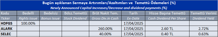 Gün içinde çıkmış veya bu sabah seans açılmadan önce açıklanmış sermaye artırımları ve temettü ödemeleri aşağıdaki tabloda görüntülenmektedir