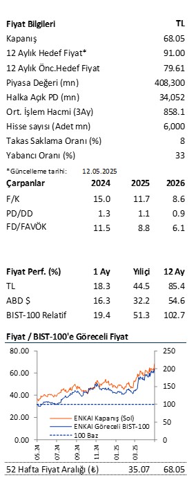 Yorum/Değerleme. Beklentilerin altında kalan net kâr sonuçlarına piyasanın ilk tepkisi hafif olumsuz olabilir. Ancak, beklentilerin hafif üzerinde gelen FAVÖK ve FAVÖK’teki yıllık bazlı güçlü büyümeyi ve bakiye sipariş büyüklüğündeki güçlü artışı olumlu olarak değerlendiriyoruz. Model portföyümüzde yer alan ENKAI için AL tavsiyemizi koruyor ve i) ileriye dönük ciro tahminlerimizdeki yukarı yönlü revizyon, ii) makro varsayımlarımızdaki güncelleme ve ve iii) İNA’nın ileriye taşınması nedeniyle ENKAI için hedef fiyatımızı hisse başına 80 TL’den 91 TL’ye yükseltiyoruz.