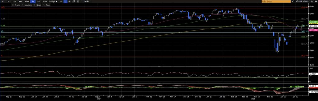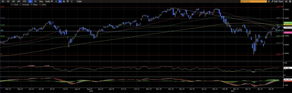 Teknik olarak bakıldığında haftalık kapanışı 5645’teki FIBO seviyesinin üzerinde gerçekleştiren S&P 500 endeksi 5750’deki 200 günlük hareketli fiyat ortalamasını hedeflemeye devam ediyor. 7 Nisan’daki dip seviyesinden 17% yükselen endeksin 5645 FIBO desteğinin altındaki kapanışlarda, 5550’deki 50 günlük ortalama ve 5485’teki Bollinger Orta bandı destek seviyeleri olarak öne çıkıyor. S&P 500 endeksi gibi 18315’teki 200 günlük ortalamasını hedeflemekte olan Nasdaq endeksi haftalık kapanışı 18135 FIBO ve trend direncinin altında gerçekleştirdi. 2025 yılındaki dip seviyesinden 21% tepki yükselişi gösteren Nasdaq endeksinde olası kar realizasyonlarında destek seviyeleri olarak 17500’deki 1 yıllık 50% FIBO ve 17350’deki 50 günlük hareketli ortalama takip edilebilir.