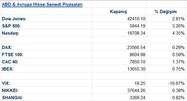 ABD hisse senedi piyasaları, ABD ile Çin arasında geçici bir ticari ateşkes ilan edilmesinin ardından güçlü kazançlar kaydetti. S&P 500 %3,26 artarak 200 günlük hareketli ortalamasını aştı ve en son 2 Nisan’daki tarife gerginliği öncesinde görülen seviyelere ulaştı. Nasdaq 100 %4,35 yükselerek boğa piyasası bölgesine yaklaştı ve büyük sermayeli teknoloji hisselerine olan ilginin yenilenmesiyle desteklendi. Dow Jones Endüstriyel Ortalaması, sektörler arasında geniş tabanlı gücü yansıtarak %2,8 oranında yükseldi. ABD Hazine Bakanı Scott Bessent, ABD Ticaret Temsilcisi Jamieson Greer ve Çinli delegelerin katılımıyla İsviçre’de gerçekleştirilen ikili görüşmelerde varılan anlaşma, ABD’nin Çin’den ithal ettiği mallara uyguladığı gümrük vergilerinin 14 Mayıs’a kadar toplam %145’ten %30’a indirilmesini öngörüyor. Çin’in ABD ürünlerine uyguladığı gümrük vergileri de %125’ten %10’a düşecek. Ateşkes, daha kapsamlı bir ticaret anlaşmasına yönelik daha fazla müzakere için üç aylık bir pencere sağlıyor. Yenilenen ticaret diyaloğu risk duyarlılığını artırdı ve sektör rotasyonlarına yol açtı.