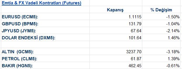 Jeopolitik ve ticaret savaşı ile ilgili risklerin azalması değerli metallerde satış baskısına neden olurken enerji ve sanayi metallerini destekledi. Ons altın 2.69% düşüşle $3235 seviyesine gerilerken ons gümüş 0.56% düşüşle $32.54 seviyesine geriledi. Diğer taraftan WTI 1.20% primle $61.75, Brent petrol ise 1.28% primle $64.73 seviyesine yükselmiş durumda.