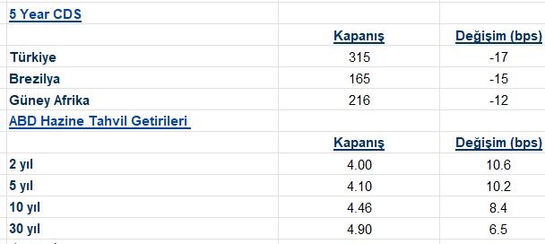 ABD ve Çin arasında varılan geçici anlaşmanın risk iştahını artırmasıyla, güvenli liman olarak görülen ABD tahvillerinde satış baskısı hakim oldu. 2 yıl vadeli kıymetin getirisi 10 baz puan artışla 3.99% seviyesine yükselirken 10 yıl vadeli tahvilin getirisi 8.7 baz puan artışla 4.46% seviyesine yükselmiş durumda. Avrupa tahvillerinde de çoğunlukla satıcılı bir seyir hakim oldu. Diğer taraftan risk iştahının yükselmesi nedeniyle gelişen ülke eurotahvilleri pozitif ayrıştı. Türkiye hazine eurotahvillerinin getirisi verim eğrisi boyunca geriledi. 2 yıl vadeli kıymetin getirisi 8 baz puan düşüşle 5.47%, 10 yıl vadeli kıymetin getirisi ise 6 baz puan düşüşle 7.45% seviyesine geriledi. 5 yıl vadeli ülke risk primi de 17 puan düşüşle 315 seviyesine geriledi.
