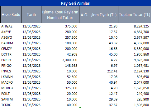 Pay geri alım programları kapsamında ilgili tarihte geri alım yapan şirketlerin listesini aşağıdaki tabloda bulabilirsiniz.
