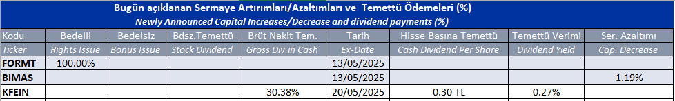 Gün içinde çıkmış veya bu sabah seans açılmadan önce açıklanmış sermaye artırımları ve temettü ödemeleri aşağıdaki tabloda görüntülenmektedir
