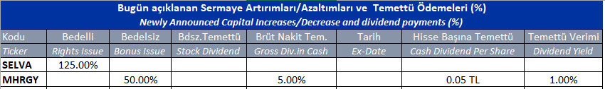 Gün içinde çıkmış veya bu sabah seans açılmadan önce açıklanmış sermaye artırımları ve temettü ödemeleri aşağıdaki tabloda görüntülenmektedir