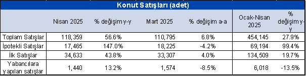 Öte yandan, 2025 Nisan itibarıyla 4 aylık kümülatif konut satışları %27,9 oranında artarak 454.145 adede ulaşmıştır. İlk el satışlar %19,7 oranında artış gösterirken, ipotekli satışlar %99,4 oranında büyüme kaydetmiştir. Ancak yabancılara yapılan satışlar aynı dönemde %13,5 oranında azalmıştır.