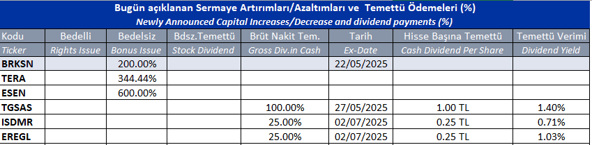 Sermaye Artırımları/Azaltımları ve Temettü Ödemeleri 22/05/2025