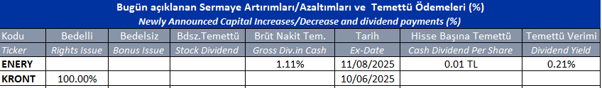 Gün içinde çıkmış veya bu sabah seans açılmadan önce açıklanmış sermaye artırımları ve temettü ödemeleri aşağıdaki tabloda görüntülenmektedir