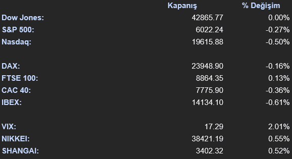 ABD endeksleri günü düşüşle tamamladı. Dow Jones Sanayi Endeksi 42.865,77 puandan kapanarak seansı yatay tamamladı. S&P 500 endeksi 6.022,3 puana gerileyerek %0,27 değer kaybetti. S&P 500 endeksinde en iyi performansı Enerji sektörü %1,49 ve Altyapı sektörü %0,05 artışla sergilerken, Takdirsel Tüketim %1,02 ve Hammadde %0,98 azalışla en zayıf performansı gösteren sektörler oldu. Nasdaq Teknoloji Endeksi ise 19.615,88 puandan günü sonlandırarak %0,50 oranında geriledi. Bloomberg Magnificent 7 Toplam Getiri Endeksi %0,8 düşüş gösterirken, küçük ölçekli şirketleri içeren Russell 2000 Endeksi de %0,4 oranında değer kaybetti.