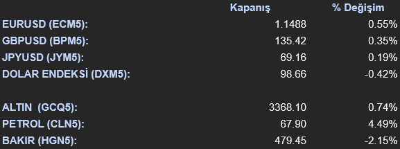 Dolar Endeksi (DXM5), 98,65 seviyesine gerileyerek %0,42 oranında bir düşüş kaydetti. EURUSD (ECM5) paritesi 1,1487 seviyesine yükselerek %0,54 değer kazandı. GBPUSD (BPM5) kontratı 135,41 seviyesinden işlem görerek %0,34 artış gösterdi. JPYUSD (JYM5) kontratı ise 69,19 seviyesine çıkarak %0,23 oranında değerlendi. Altın vadeli kontratları (GCQ5) %0,78 artışla ons başına 3.369,6 dolardan kapandı. Ham petrol (CLN5) vadeli kontratları %4,47 gibi önemli bir artışla varil başına 67,89 dolara yükseldi. Bakır vadeli kontratları (HGN5) ise %2,12 düşüşle 479,6 seviyesinden işlem gördü. LME Bakır fiyatları %1,11 azalışla ton başına 9.648 dolara gerilerken, LME Alüminyum %0,92 artışla 2.515,5 dolara yükseldi. LME Çinko ise %0,15’lik bir düşüşle 2.653,5 dolardan kapandı. COMEX Altın fiyatları %0,79 artışla ons başına 3.369,8 dolara ulaştı. COMEX Gümüş fiyatları ise %0,81 düşüşle ons başına 36,34 dolardan işlem gördü. Brent petrol fiyatları da %3,98 artışla varil başına 69,53 dolara yükseldi. Ekonomik Veri Akışı Bugün açıklanan ABD Mayıs ayı çekirdek enflasyon verisi, beklentilerin altında bir artış gösterdi. Bu durum, şirketlerin artan gümrük vergisi maliyetlerini henüz tüketicilere tam olarak yansıtmadığı şeklinde yorumlanırken, ekonomistler önümüzdeki aylarda firmaların fiyatları daha belirgin bir şekilde artırmasını bekliyorlar.Mer kez Bankası Yorumları Piyasa katılımcıları, Fed Başkanı Powell’ın para politikası konusundaki “ince çizgide yürüdüğünü” ve gelecek haftaki Fed basın toplantısında para politikasının geleceğine dair ipuçları arayacağını belirtiyorlar. Yatırımcılar, Eylül ayında bir faiz indirimi olasılığını yaklaşık %75 olarak fiyatlıyor.