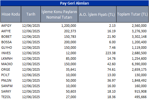 Pay geri alım programları kapsamında ilgili tarihte geri alım yapan şirketlerin listesini aşağıdaki tabloda bulabilirsiniz. Uyarı Notu: Sabah 9:00'a kadar...