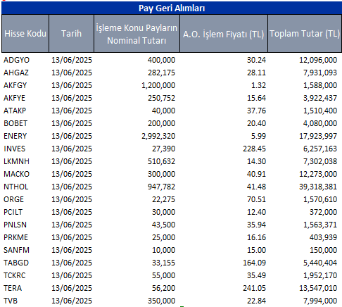 Pay geri alım programları kapsamında ilgili tarihte geri alım yapan şirketlerin listesini aşağıdaki tabloda bulabilirsiniz. Uyarı Notu: Sabah 9:00'a kadar...