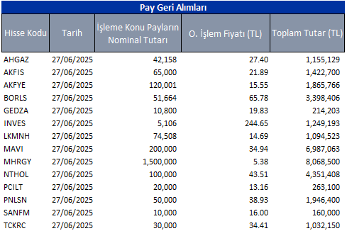 Pay geri alım programları kapsamında ilgili tarihte geri alım yapan şirketlerin listesini aşağıdaki tabloda bulabilirsiniz.