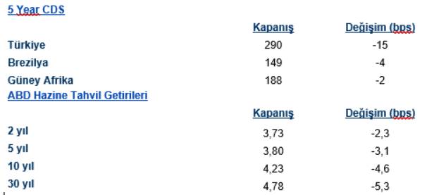 ABD tahvil piyasasında genel olarak alıcılı ortam izlenen ABD tahvil piyasasında 2 yıllık getirilerde 2,9 bps’lik düşüş gözlemlenirken 5 yıllık tahvil getirilerinde 3,3 bps’lik düşüş izlendi. 10 yıllık tahvillerde de 4,9 bps’lik düşüş izlendi. Avrupa tarafında da genel olarak alıcılı seyir hakimdi. Yurtiçi eurotahvil piyasasında ise sert satıcılı ortam izlenirken son günlerde takip edilen siyasi gündem piyasanın pozitif tarafta kalmasına neden oldu. 5 yıllık CDS risk primi 289 seviyesine ulaştı.